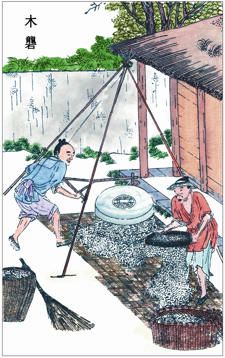 在河边使用水碓的地方,有人一生也没见过砻,一直都是用臼给稻谷去除糠皮,只有使用风车和筛子的方法没有区别。磨用石头砌成,碾盘和转轮都用石头做成。用牛犊或马驹拉磨随人自便,一头牛的力量,相当于五个人的力量。但要加工的稻谷,一定是非常干燥的,稍有潮湿,米就会碎断。