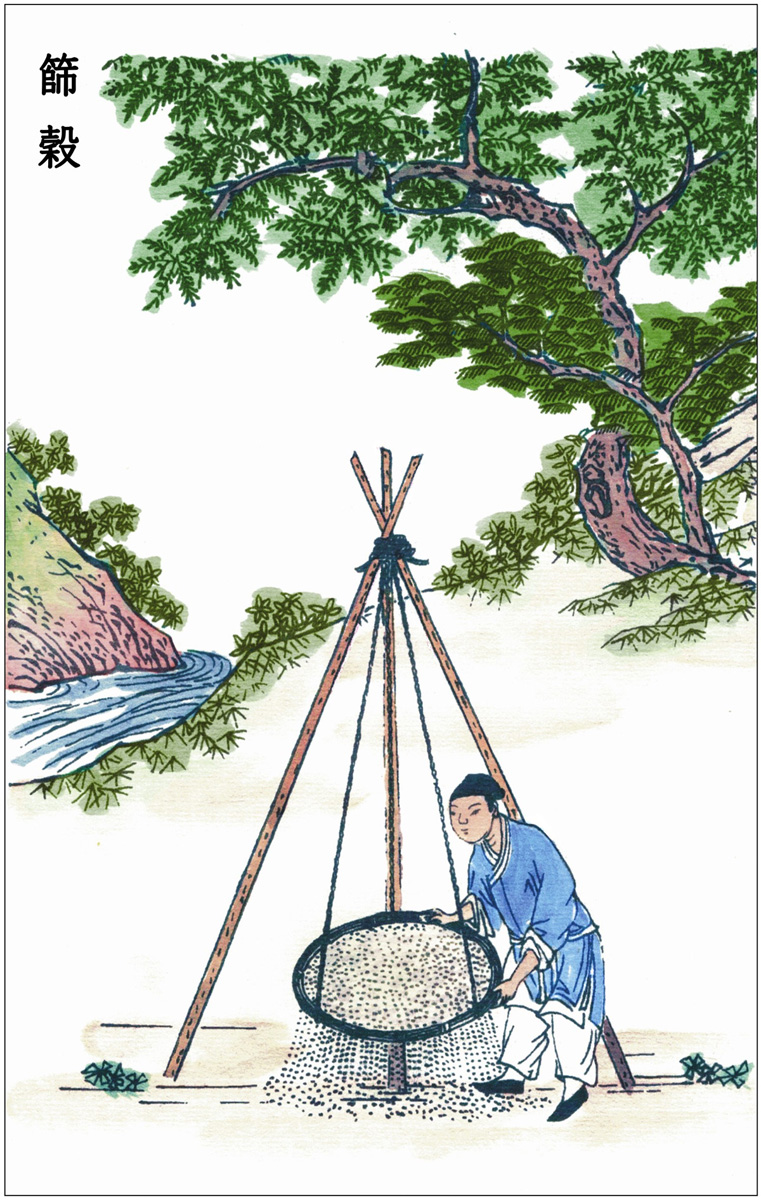 凡既砻,则风扇以去糠秕,倾入筛中团转。谷未剖破者浮出筛面,重复入砻。凡筛大者围五尺,小者半之,大者其中心偃〔11〕隆而起,健夫利用。小者弦高二寸,其中平窐〔12〕,妇子所需也。凡稻米既筛之后,入臼而舂,臼亦两种。八口以上之家掘地藏石臼其上,臼量大者容五斗,小者半之。横木穿插碓头(碓嘴治铁为之,用醋滓合上),足踏其末而舂之。不及则粗,太过则粉,精粮从此出焉。晨炊无多者,断木为手杵,其臼或木或石以受舂也。既舂以后,皮膜成粉,名曰细糠,以供犬豕〔13〕之豢〔14〕。荒歉之岁,人亦可食也。细糠随风扇播扬分去,则膜尘净尽而粹精见矣。
