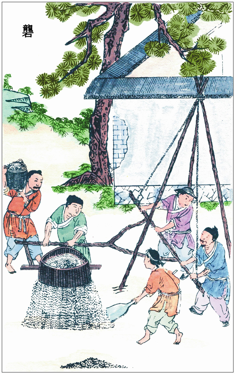 经过砻的加工后,还要用风车扇去糠秕,然后倒进筛子,转圈过筛。没有破壳的稻谷会浮在上面,再装进砻内加工。大筛子周长五尺,小的减半。大筛子中间凸起,是强壮的人使用的。小筛子边高二寸,中间微微低洼,供妇女儿童使用。稻米筛过后,放进臼内舂。臼也分为两种。八口以上的人家在地上挖坑,中间放进石臼,容量大的可以装五斗稻米,小的容量减半。用一条横木穿进碓头(碓嘴用铁做成,用醋滓将它和碓头接合上),脚踩横木的末端舂米。舂得功夫不够,米就会粗糙,舂得过度,米就会太细碎,精米就是这样做出来的。早晨做饭时,人口不多的人家,用一截木头做手杵,用木头或石头当作臼。舂米后,稻糠就变成了粉,名叫细糠,用来喂养狗和猪。灾荒歉收的年份,人也可以吃。细糠被风车扇去,糠皮和灰尘都被清除干净,留下的就是精米了。