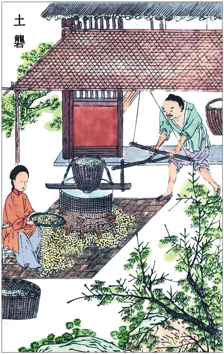 凡稻去壳用砻〔9〕,去膜用舂、用碾。然水碓主舂,则兼并砻功,燥干之谷入碾亦省砻也。凡砻有二种,一用木为之,截木尺许(质多用松),斫合成大磨形,两扇皆凿纵斜齿,下合植榫穿贯上合,空中受谷。木砻攻米二千余石,其身乃尽。凡木砻,谷不甚燥者入砻亦不碎,故入贡军国漕储千万,皆出此中也。一土砻,析竹匡围成圈,实洁净黄土于内,上下两面各嵌竹齿。上合空受谷,其量倍于木砻。谷稍滋湿者入其中即碎断。土砻攻米二百石,其身乃朽。凡木砻必用健夫,土砻即孱妇弱子可胜其任。庶民饔飧〔10〕皆出此中也。