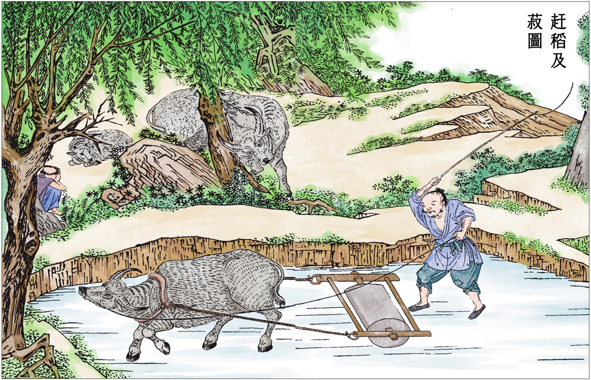 凡服牛〔4〕曳石滚压场中,视〔5〕人手击取者力省三倍。但作种之谷,恐磨去壳尖,减削生机。故南方多种之家,场禾多藉牛力,而来年作种者则宁向石板击取也。