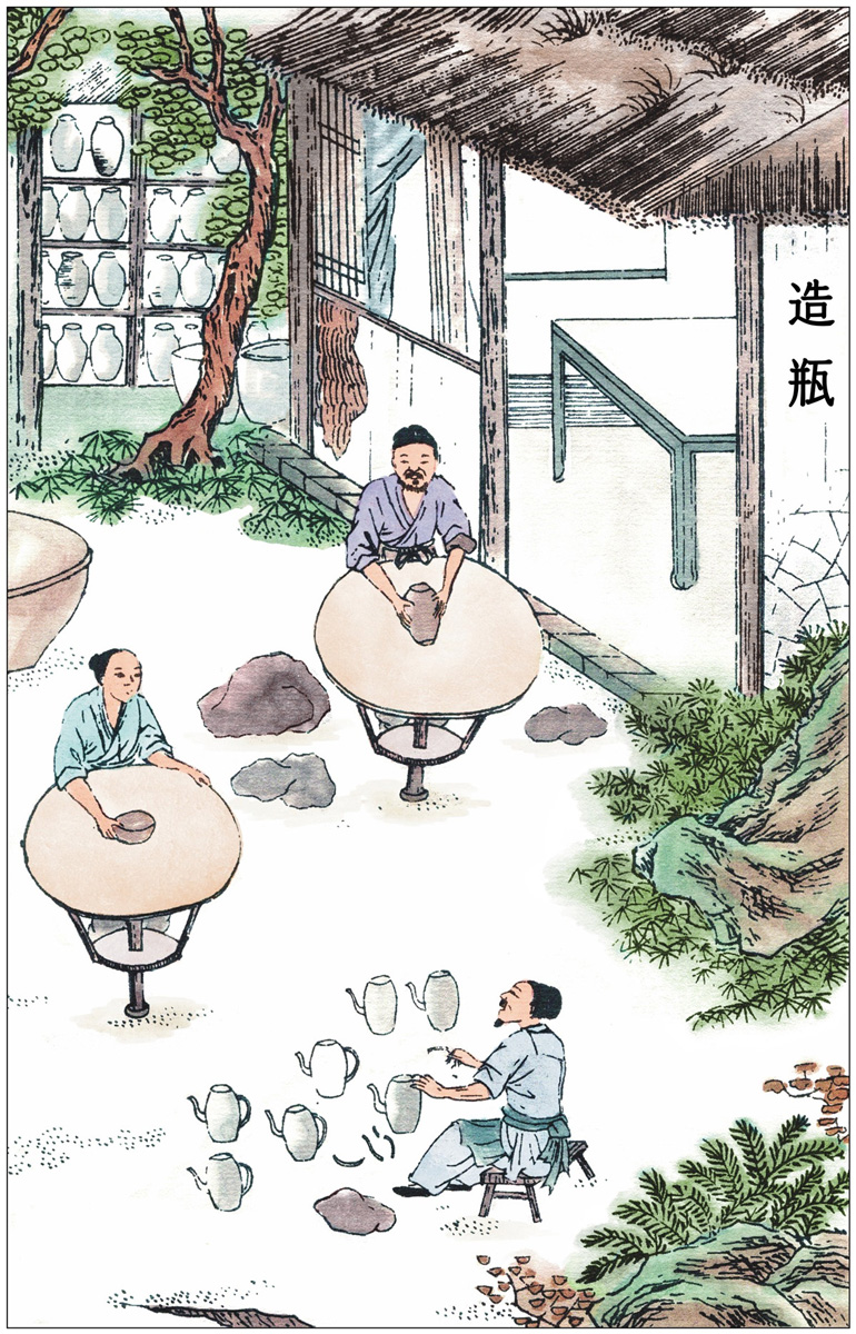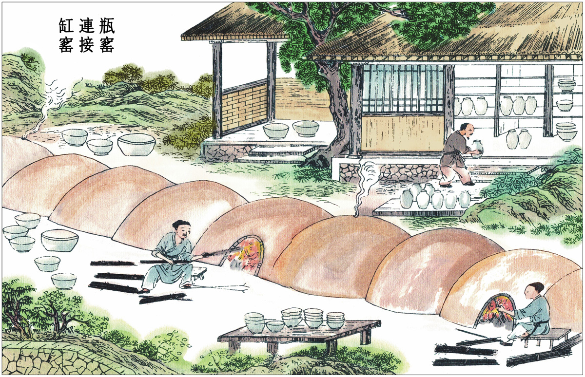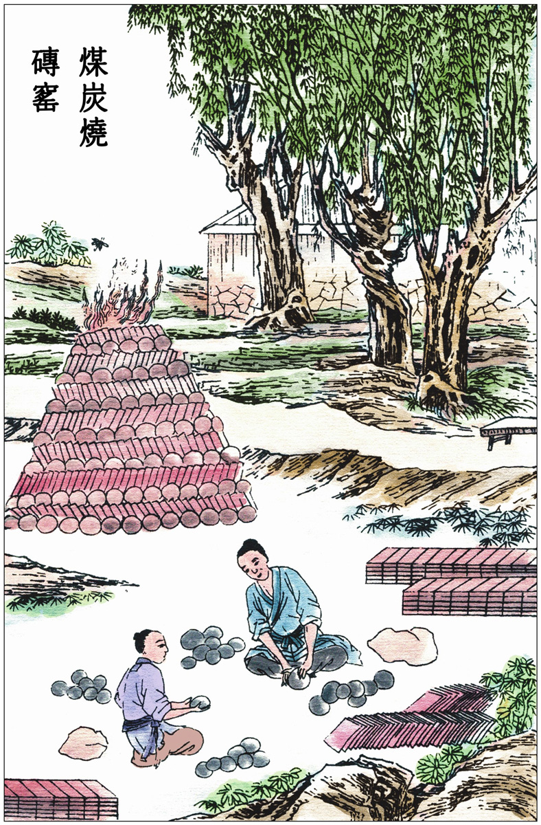 凡转泑之法,窑巅作一平田样,四围稍弦起,灌水其上。砖瓦百钧用水四十石〔13〕。水神透入土膜之下,与火意相感而成。水火既济,其质千秋矣。若煤炭窑视柴窑深欲倍之,其上圆鞠渐小,并不封顶。其内以煤造成尺五径阔饼,每煤一层,隔砖一层,苇薪垫地发火。