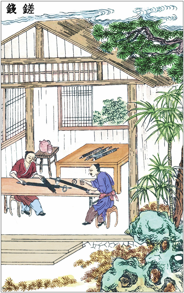 凡铸钱模以木四条为空框(木长一尺一寸,阔一寸二分)。土炭末筛令极细,填实框中,微洒杉木炭灰或柳木炭灰于其面上,或熏模则用松香与清油。然后以母钱〔6〕百文(用锡雕成)或字或背布置其上。又用一框如前法填实合盖之。既合之后,已成面、背两框,随手覆转,则母钱尽落后框之上。又用一框填实,合上后框,如是转覆,只合十余框,然后以绳捆定。其木框上弦原留入铜眼孔,铸工用鹰嘴钳,洪炉提出熔罐,一人以别钳扶抬罐底相助,逐一倾入孔中。冷定解绳开框,则磊落百文,如花果附枝。模中原印空梗,走铜如树枝样,挟出逐一摘断,以待磨锉成钱。凡钱先锉边沿,以竹木条直贯数百文受锉,后锉平面则逐一为之。