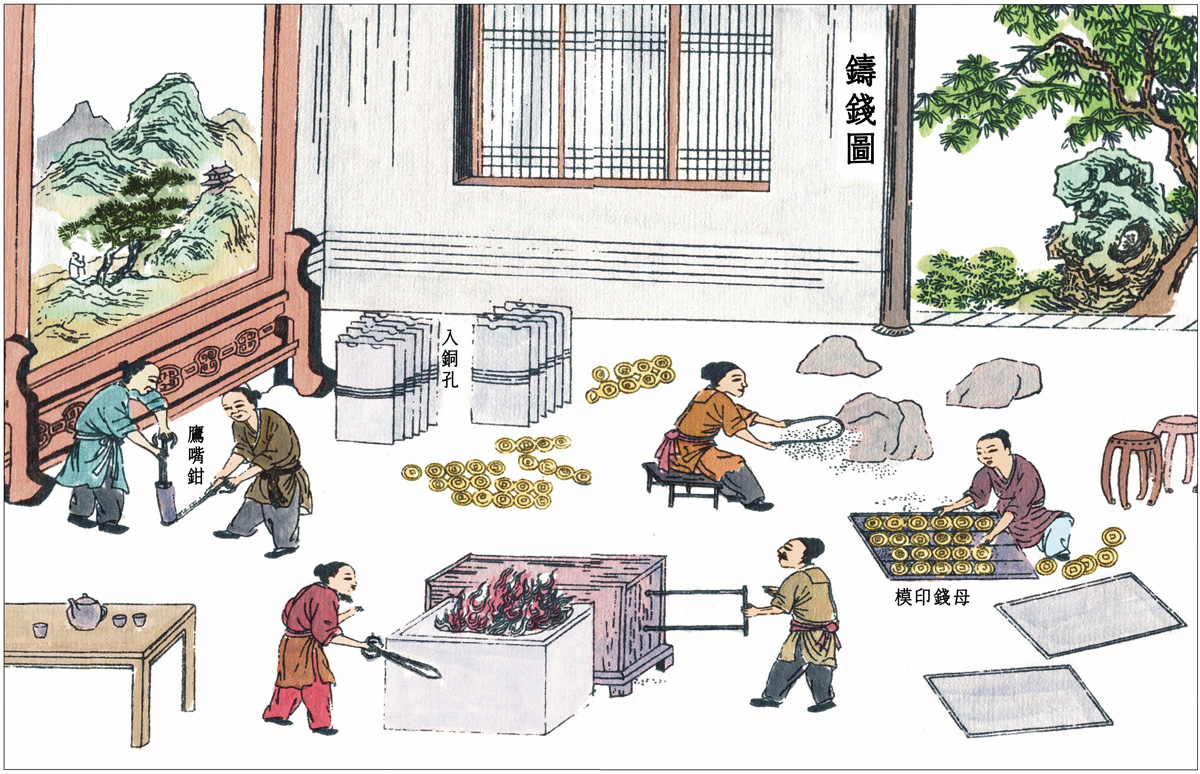 铸钱的模子,是用四个木条做成的框子(木条长一尺一寸,宽一寸二分)。然后将土和炭末筛出非常细的粉末,填充在框子中,再在表面撒上少量的杉木炭灰或柳木炭灰,或用松香和清油燃烧产生的烟熏过。然后拿一百文母钱(用锡雕琢而成),将有文字的一面或没有文字的背面放在框面上。再拿一个框子,用前面所说的方法用泥和炭粉填充,然后盖上。盖好后就形成了面和底两个框模,随手将它翻转过来,母钱就都脱落在后框上。再用一个框子填充好,盖在后框上,照样翻转,如此反复,做成十多个框模,然后用绳子绑定。木框边缘上留有灌注铜液的孔洞,铸工用鹰嘴钳从炉内把熔罐取出,另一个人用钳托住罐的底部,逐个将罐里的铜液倒进孔中。冷却后解开绳子打开框子,就会看到连在一起的上百文钱,就像树枝上的花果一样。模子中铜液的通路,也留下了像树枝一样的铜条网络。将它们夹出来把铜钱逐个掐断,以便打磨加工。打磨钱币时,首先要打磨边缘,用竹条或木条将一百文钱串起来一起打磨,然后逐个将表面打磨好。