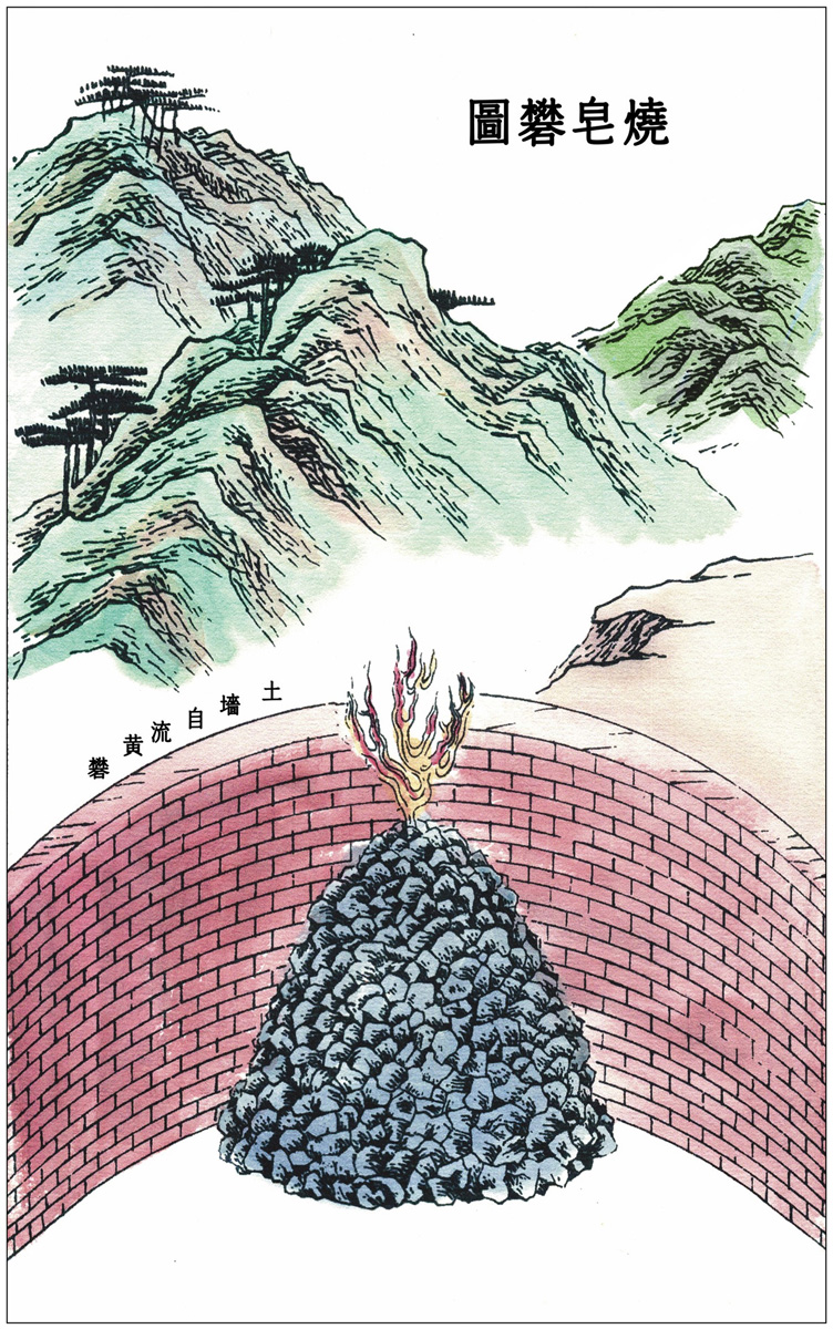 【原文】凡皂、红、黄矾,皆出一种而成,变化其质。取煤炭外矿石(俗名铜炭)子,每五百斤入炉,炉内用煤炭饼(自来风,不用鼓鞲者)千余斤,周围包裹此石。炉外砌筑土墙圈围,炉巅〔1〕空一圆孔,如茶碗口大,透炎直上,孔旁以矾滓厚掩(此滓不知起自何世,欲作新炉者,非旧滓掩盖则不成)。然后从底发火,此火度经十日方熄。其孔眼时有金色光直上(取硫,详后款)。煅经十日后,冷定取出。半酥杂碎者另拣出,名曰时矾,为煎矾红用。其中精粹如矿灰形者,取入缸中浸三个时,漉〔2〕入釜中煎炼。每水十石煎至一石,火候方足。煎干之后,上结者皆佳好皂矾,下者为矾滓(后炉用此盖)。此皂矾染家必需用,中国煎者亦惟五六所。原石五百斤,成皂矾二百斤,其大端也。其拣出时矾(俗又名鸡屎矾),每斤入黄土四两,入罐熬炼,则成矾红,圬〔3〕墁及油漆家用之。