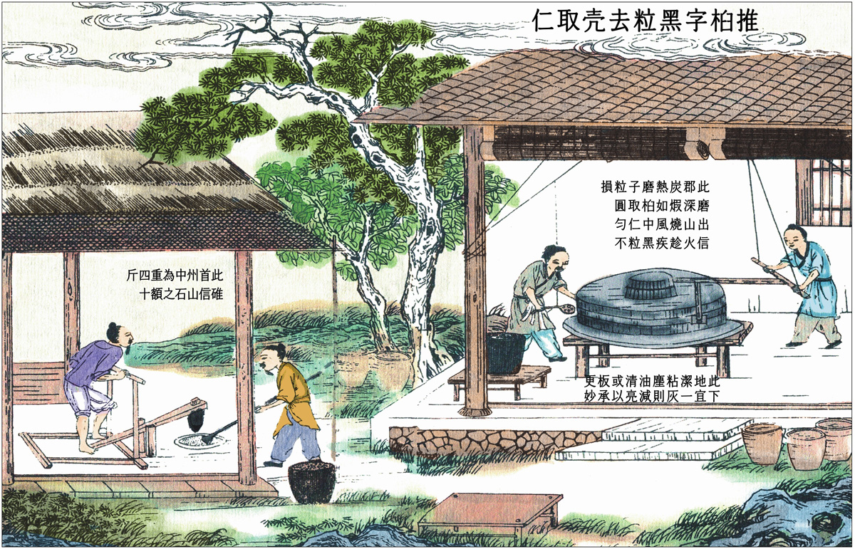 若水煮法,则并用两釜。将蓖麻、苏麻子碾碎,入一釜中,注水滚煎,其上浮沫即油。以杓〔9〕掠取,倾于干釜内,其下慢火熬干水气,油即成矣。然得油之数毕竟减杀。北磨麻油法,以粗麻布袋捩〔10〕绞,其法再详。