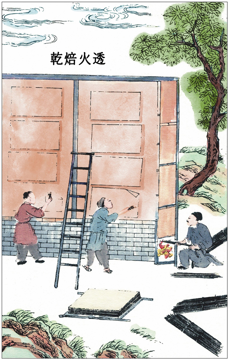 凡造皮纸长阔者,其盛水槽甚宽,巨帘非一人手力所胜,两人对举荡成。若棂纱,则数人方胜其任。凡皮纸供用画幅,先用矾水荡过,则毛茨不起。纸以逼〔3〕帘者为正面,盖料〔4〕即成泥浮其上者,粗意犹存也。