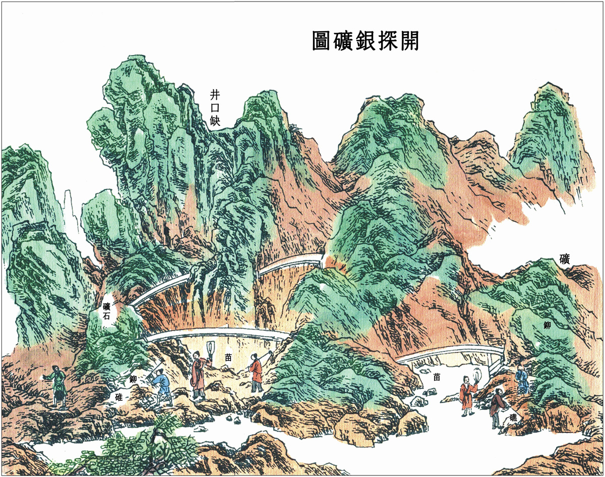 凡云南银矿,楚雄、永昌、大理为最盛,曲靖、姚安次之,镇沅又次之。凡石山硐〔4〕中有铆砂,其上现磊然小石,微带褐色者,分丫成径路。采者穴土十丈或二十丈,工程不可日月计。寻见土内银苗,然后得礁砂〔5〕所在。凡礁砂藏深土,如枝分派别,各人随苗分径横挖而寻之。上楮横板架顶,以防崩压。采工篝灯逐径施镬,得矿方止。凡土内银苗,或有黄色碎石,或土隙石缝有乱丝形状,此即去矿不远矣。凡成银者曰礁,至碎者曰砂,其面分丫若枝形者曰铆,其外包环石块曰矿。矿石大者如斗,小者如拳,为弃置无用物。其礁砂形如煤炭,底衬石而不甚黑,其高下有数等(商民凿穴得砂,先呈官府验辨,然后定税)。出土以斗量,付与冶工,高者六七两一斗,中者三四两,最下一二两(其礁砂放光甚者,精华泄露,得银偏少)