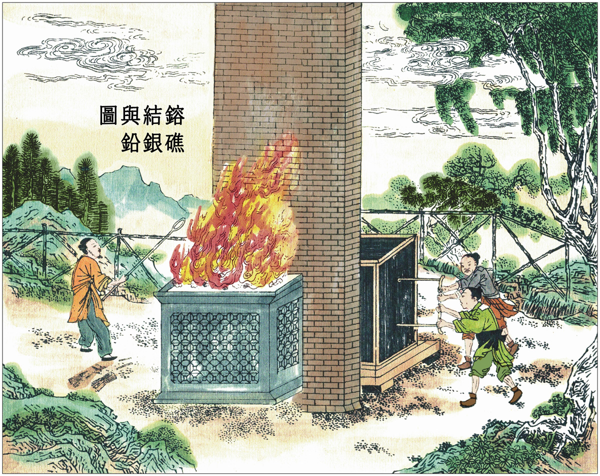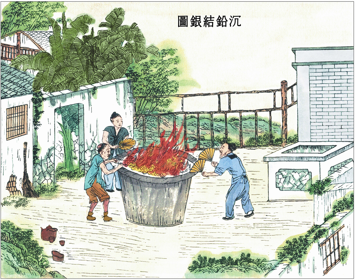 礁砂在入炉前,首先要经过挑选淘洗。炼银的炉子是用泥土制成的大墩子,高五尺左右,下面用瓷片和炭灰铺垫,每个炉子可容纳礁砂两石。将两百斤栗木炭在周围堆架起来,在炉子旁边砌一道砖墙,高和宽均为一丈左右。靠墙安装风箱,由两三个人合力拉动风箱鼓风。用墙来隔热,拉风箱的人才有安身之处。炭烧完后,用长铁叉再添新炭。风吹火旺,礁砂就会熔化变成团状。这时,银子还混在铅中,没有分离出来,两石礁砂熔化成团大约有一百斤重。冷却后取出来,放进另一个分金炉(也叫虾蟆炉)里,用松木炭围住,透过一扇门分辨火的颜色。这样的炉子,有的用风箱鼓风,有的用团扇扇风。火烧起来达到一定温度后,铅就会沉到下面(炉子底部的铅已经变成氧化铅,再放进别的炉子熔炼,又会形成扁担铅)。用柳树枝不断地从门缝插进去燃烧,铅气消失后,便凝结成可作为流通货币的白银。一开始炼成的银,也叫生银。倒出来凝固后,如果没有丝纹,就要再用火熔炼,直到凝固后的银锭中心出现一点圆星,云南人称之为“茶经”。随后加入少量的铜,再借助铅来熔化,然后倒进槽里就会出现丝纹(一定要倒进槽里才会出现丝纹,因为四周都被围住,银气不会挥发出去)。云南楚雄地区出产的银子又有些不同,那里的矿砂含铅量很少,要从其他地方购买铅来做炼银的辅料。每炼礁砂一百斤,先要用两百斤的铅铺垫在炉内,然后鼓风熔炼成团状。随后转入虾蟆炉使铅沉淀结出银锭,之后的炼制方法与前文相同。可作为流通货币的白银就是这样生产出来的,再无其他方法了。讲方术的书和谈医药的《本草纲目》中总有毫无根据的臆想和胡乱的注释,非常讨厌。