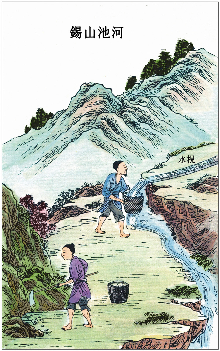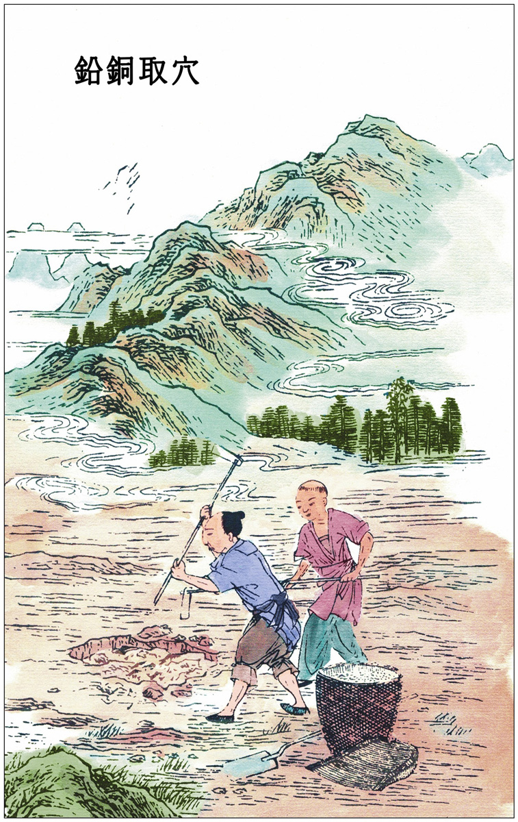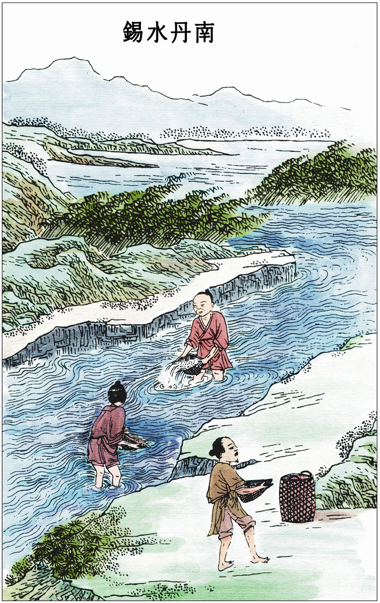 凡锡有山锡、水锡两种。山锡中又有锡瓜、锡砂两种。锡瓜块大如小瓠〔5〕,锡砂如豆粒,皆穴土不甚深而得之。间或土中生脉充轫〔6〕,致山土自颓,恣人拾取者。水锡衡、永出溪中,广西则出南丹州河内,其质黑色,粉碎如重罗面〔7〕。南丹河出者,居民旬〔8〕前从南淘至北,旬后又从北淘至南。愈经淘取,其砂日长,百年不竭。但一日功劳,淘取煎炼不过一斤。会计炉炭资本,所获不多也。南丹山锡出山之阴,其方无水淘洗,则接连百竹为枧〔9〕,从山阳枧水淘洗土滓,然后入炉。