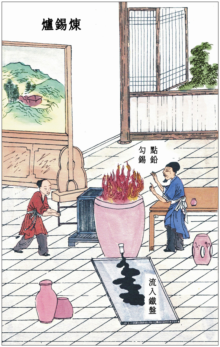 熔炼也要使用火炉,放进一百斤锡砂,将几百斤木炭架起来,鼓风加温熔炼。火力足够时,锡砂不会立刻熔化,加入少量的铅作为引子,锡才开始熔化大量流出。有的人使用别人炒锡剩下的炉渣作为引子。炉底用炭灰和磁灰铺成平池,旁边安装铁管小槽道,熔炼后的锡水流到炉外低处的池子里。锡水起初呈洁白的颜色,但过于脆韧,用锤子敲打就会断裂。加入铅就可以使锡变软,这样才能制造器物。市场上出售的锡含有大量的铅,想要将其提纯就需要熔化后加入醋,醋与锡经过八九次的接触,其中的铅就会全部化为灰烬而被去除。制造锡器只能使用这种方法。方书上说可以从马齿苋中提取草锡,这是在胡说。还有人说砒就是锡矿的矿苗,也是毫无根据的说法。