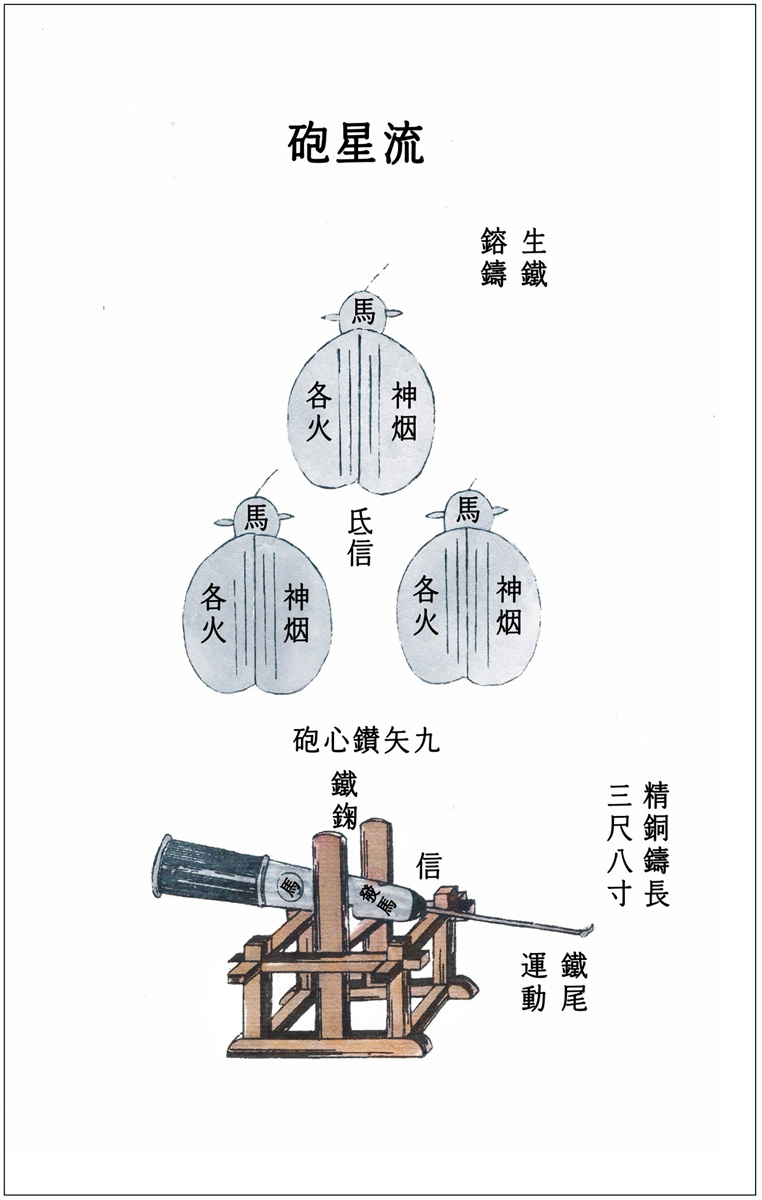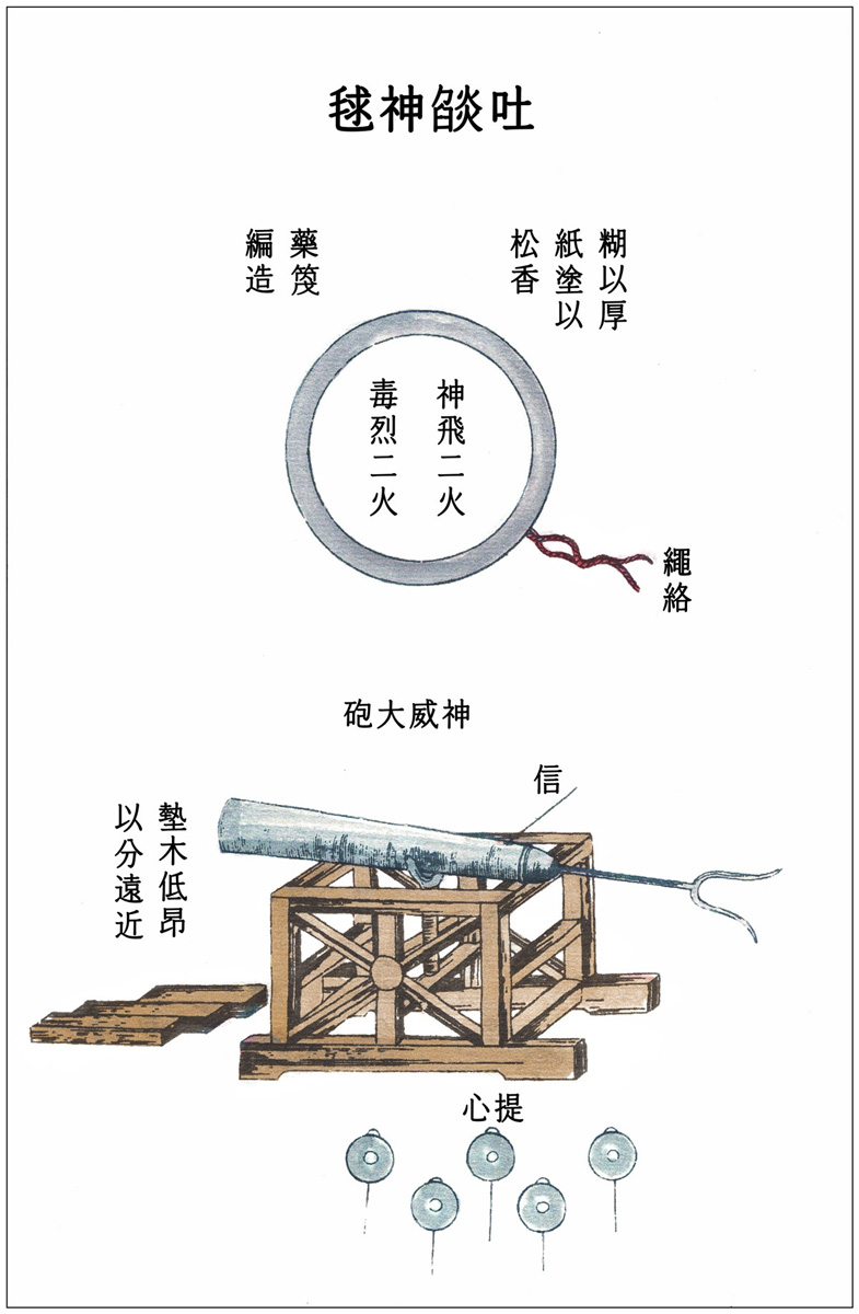 万人敌。凡外郡小邑乘城却敌,有炮力不具者,即有空悬火炮而痴重难使者,则万人敌近制随宜可用,不必拘执一方也。盖硝、黄火力所射,千军万马立时糜烂。其法:用宿干空中〔6〕泥团,上留小眼筑实硝、黄火药,掺入毒火、神火,由人变通增损。贯药安信而后,外以木架匡正围,或有即用木桶而塑泥实其内郭者,其义亦同。若泥团必用木框,所以妨掷投先碎也。敌攻城时,燃灼引信,抛掷城下。火力出腾,八面旋转。旋向内时,则城墙抵住,不伤我兵;旋向外时,则敌人马皆无幸。此为守城第一器。而能通火药之性、火器之方者,聪明由人。作者不上十年,守土者留心可也。