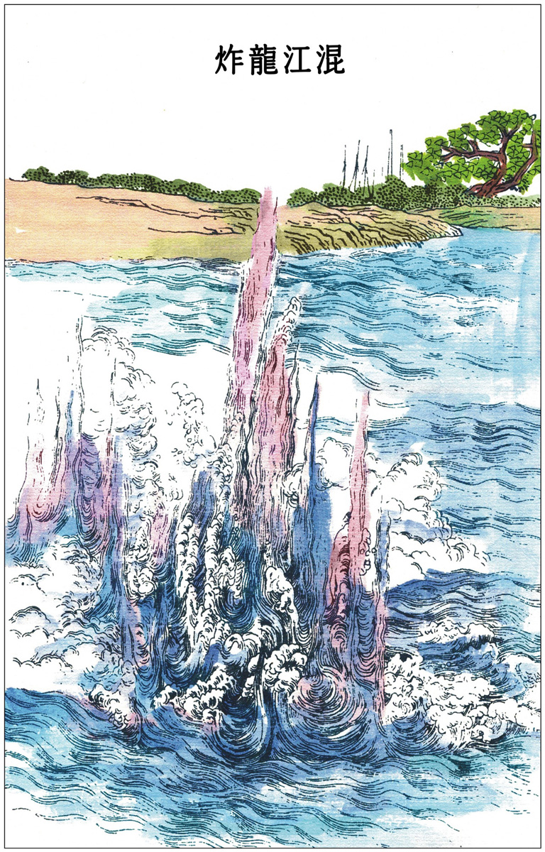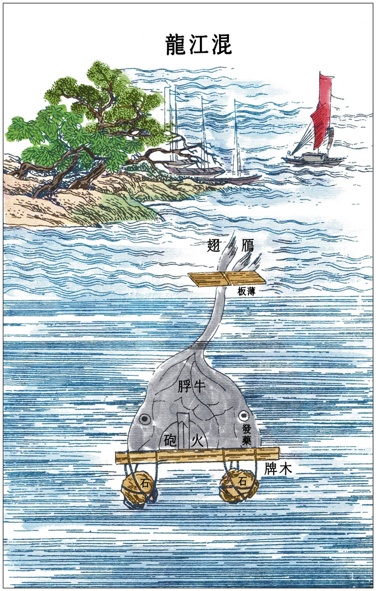 混江龙,将炮用皮囊包裹,外面用漆密封,然后将其沉到水底,岸上连接着“索引机”。皮囊内悬挂火石、火镰,一旦触发索引机,皮囊就会自动爆炸。敌方的船只经过时,遇到混江龙就会被炸毁。但这终究是个笨重的东西。