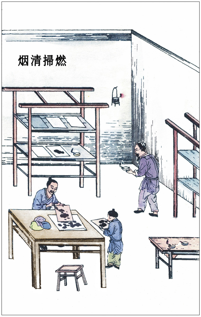 凡烧松烟,伐松斩成尺寸,鞠〔6〕篾为圆屋,如舟中雨篷式,接连十余丈。内外与接口皆以纸及席糊固完成。隔位数节,小孔出烟,其下掩土砌砖先为通烟道路。燃薪数日,歇〔7〕冷入中扫刮。凡烧松烟,放火通烟,自头彻尾。靠尾一二节者为清烟,取入佳墨为料。中节者为混烟,取为时墨料。若近头一二节,只刮取为烟子,货卖刷印书文家,仍取研细用之。其余则供漆工垩工〔8〕之涂玄〔9〕者。