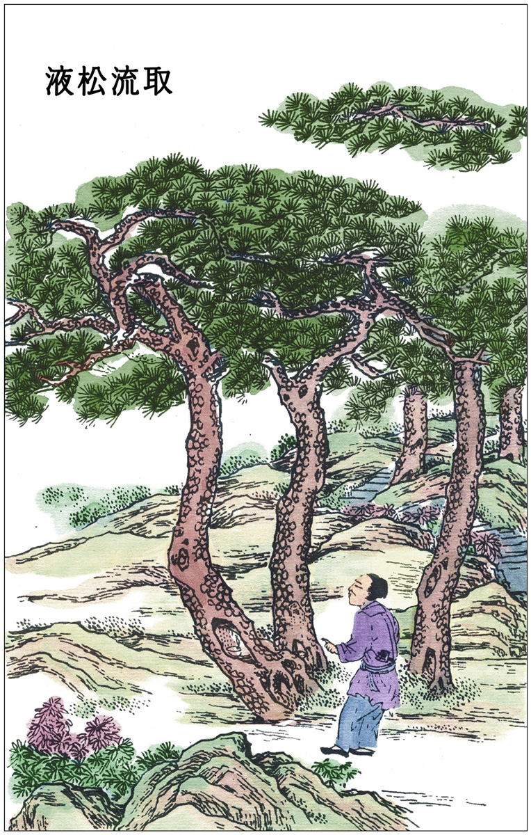 凡爇〔4〕油取烟,每油一斤,得上烟一两余。手力捷疾者,一人供事灯盏二百副。若刮取怠缓则烟老,火燃质料并丧也。其余寻常用墨,则先将松树流去胶香,然后伐木。凡松香有一毛未净尽,其烟造墨,终有滓结不解之病。凡松树流去香〔5〕,木根凿一小孔,炷灯缓炙,则通身膏液就暖倾流而出也。