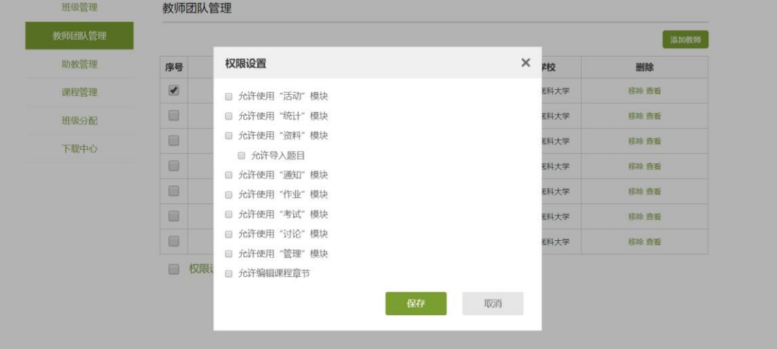 点击“权限设置”可以设置教学团队对当前课程的操作权限。