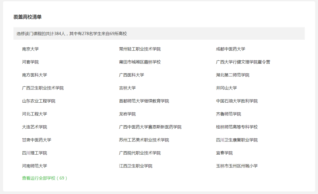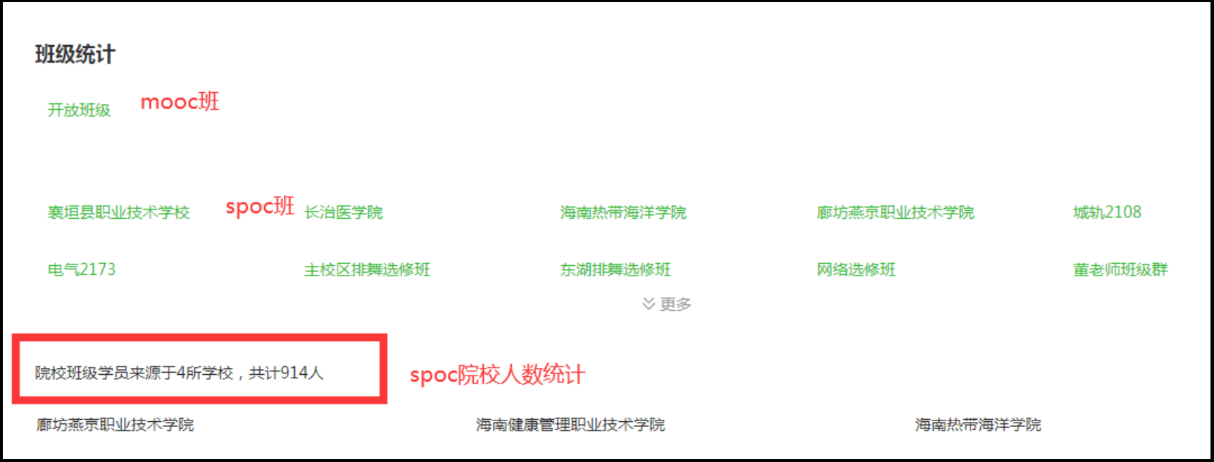 根据班级类型,mooc 班级和 spoc 班级分开展示,可以查看spoc选课院校及学生人数统计。点击班级名称可跳转【统计】模块。