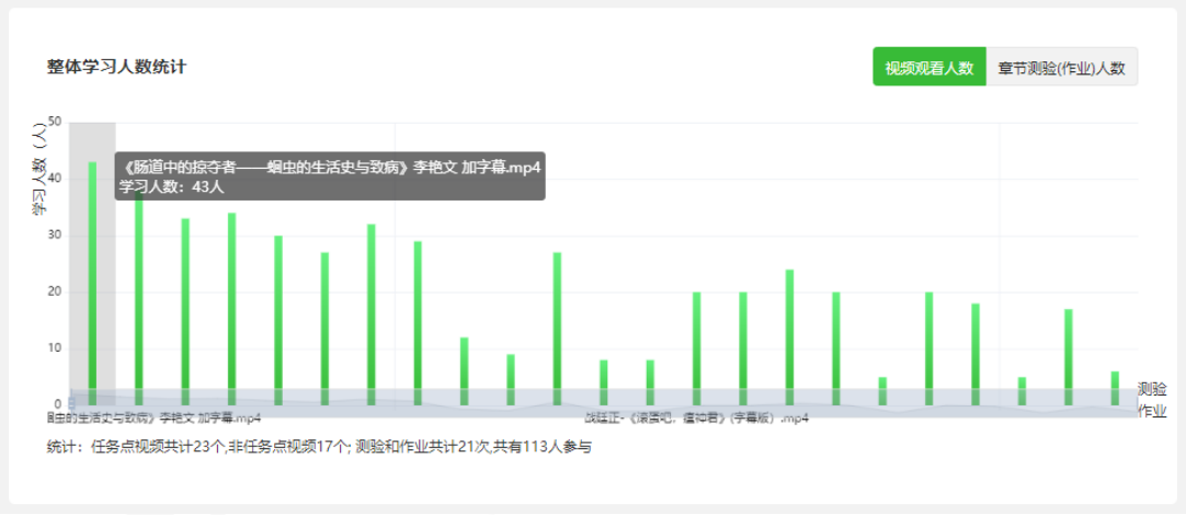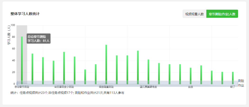 统计章节测验和作业的总数,对于参与人数为实际参与人去重后的数据。