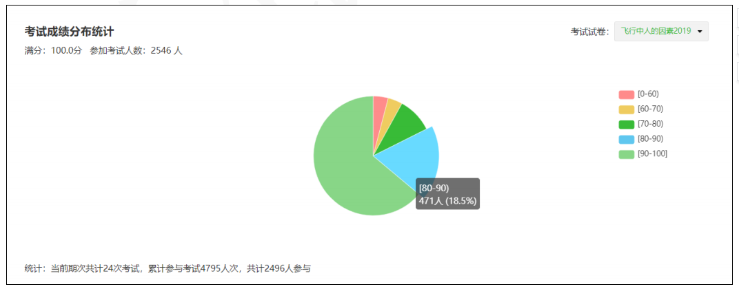 点击【课程门户-课程统计】进行当前期次的数据统计页面,在页面上方可以选择切换期次。主要包括课程资源统计、班级统计、选课统计、整体学习人数统计、讨论数据统计、考试成绩分布统计、课程通过情况、覆盖高校清单。