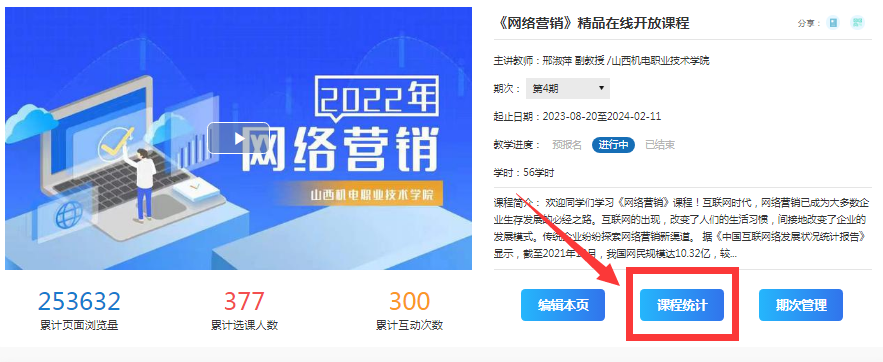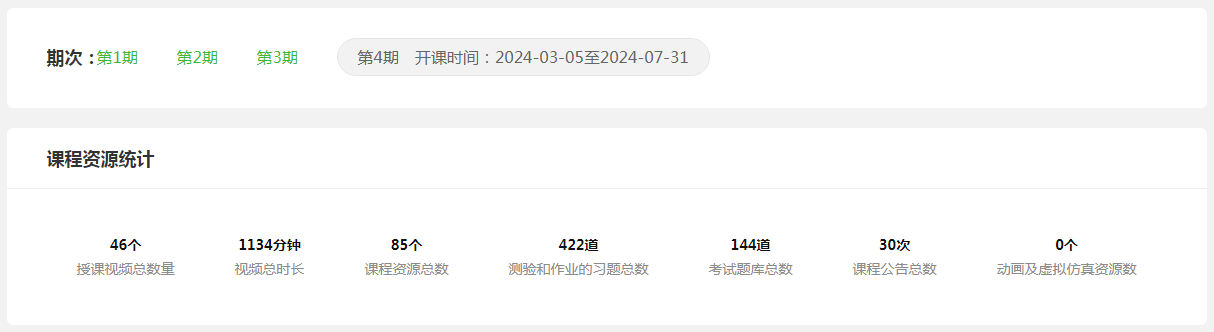 教师可在此处看到当前期次下课程资源的数据统计情况,如图: