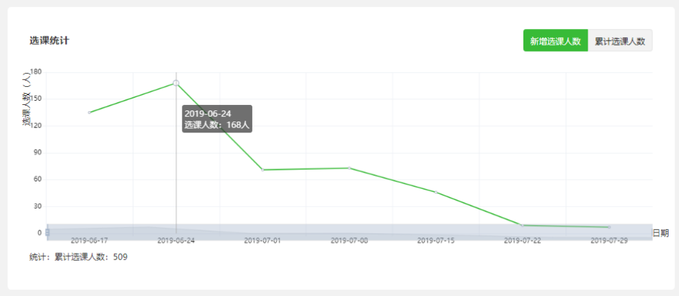 按照新增选课人数、累计选课人数分别以折线图的形式展示,累计选课人数为当前期次下班级实际的总人数。