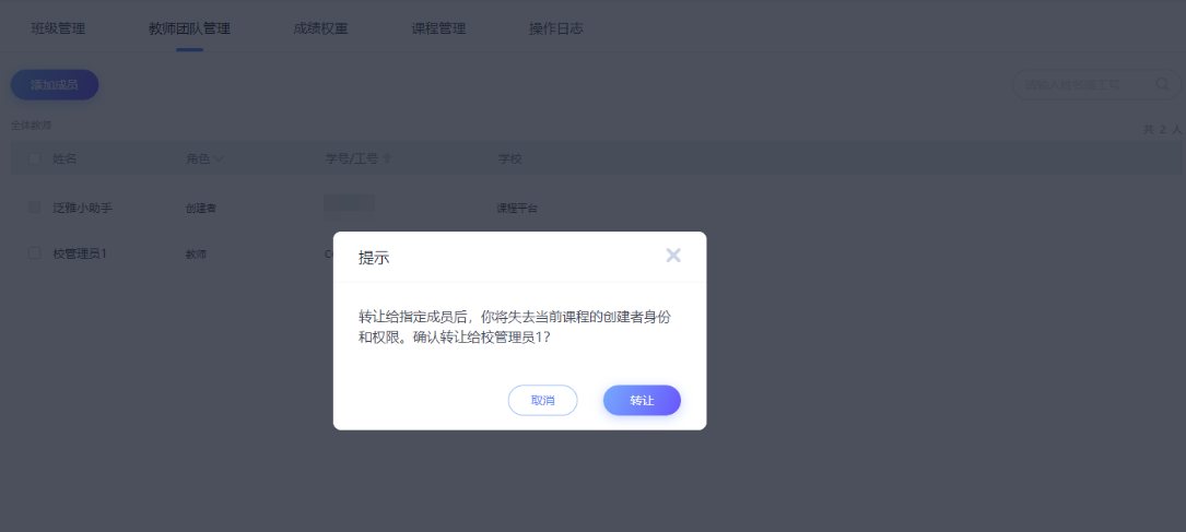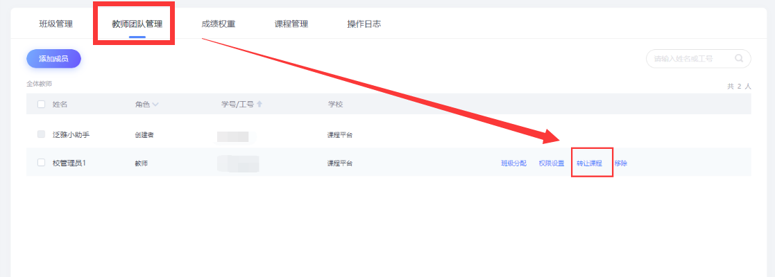 】-【添加成员】-点击要转让的教师-【转让课程】