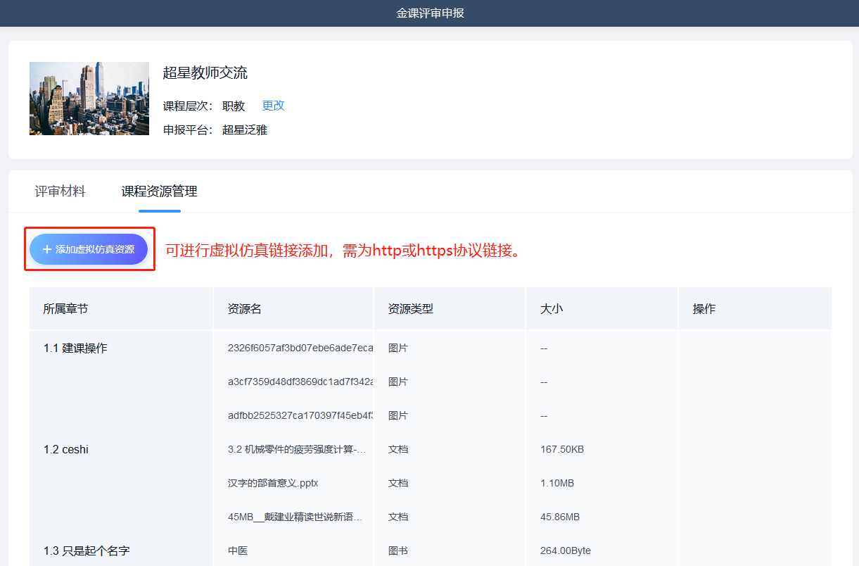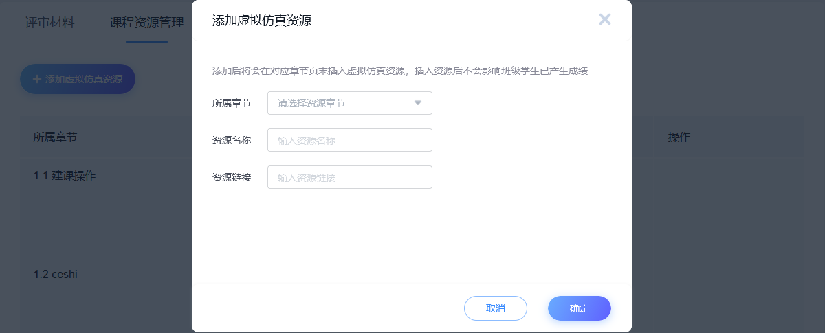 进入课程-体验新版-管理-课程评审-课程资源管理-添加虚拟仿真资源