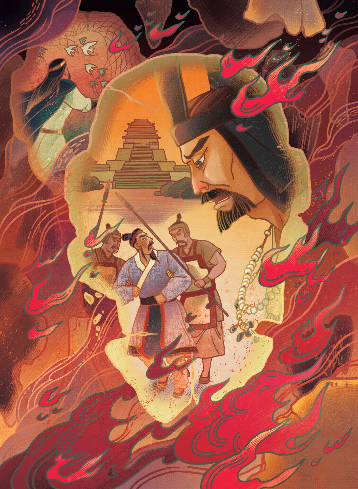 商纣创造出一种刑罚—炮烙(páo luò)之刑。这种刑罚先是将铜柱横倒,涂上油膏,然后用炭火在下面炙烤,待一切准备妥当,行刑者命令那些不服从的囚犯在上面缓缓行走。可想而知,走不了几步,囚犯便会被活活烫死。