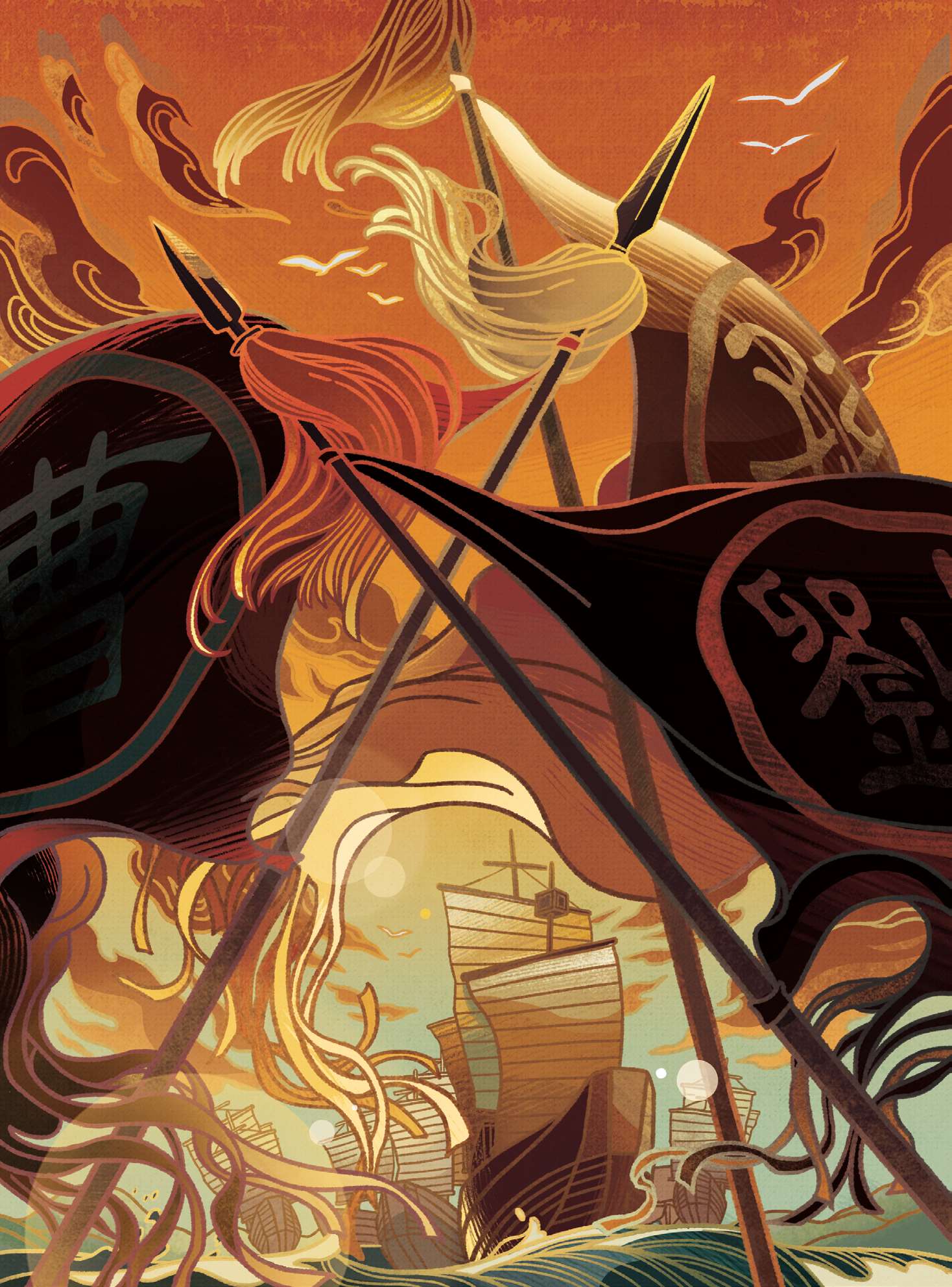 一天晚上,刮起东南风,江面上波浪滔天。黄盖要去投降了。十艘战船排在最前,其余船只紧随其后,依次前行。战船才到江心便扯满风帆,箭一般驶向北岸。曹营中士卒都走出船舱观看,高兴地等待黄盖来降,并未想到东吴船队在离岸约二里时,忽然同时点火。霎时间,十条火龙借着风势向着曹营猛冲而来。曹营的战船连在一起,难以解开,谁都无法逃脱,顷刻间化作一片火海。