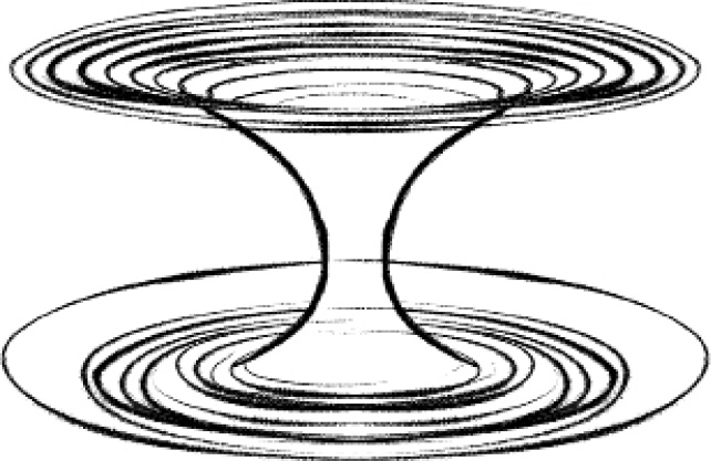 “这可能是史上最偷懒的飞行方式,接下来可真的有点考验画技了,”他干脆信笔一挥,“假设粉笔是一艘飞船,它就要从黑洞的入口飞进去了,通过这座桥——连接黑洞和白洞的细管——可以立刻从白洞的出口飞出来。相比黑洞,白洞总是没什么胃口,它会将飞船吐出来。穿梭于黑洞和白洞两个空间的方案就这么写好了。”