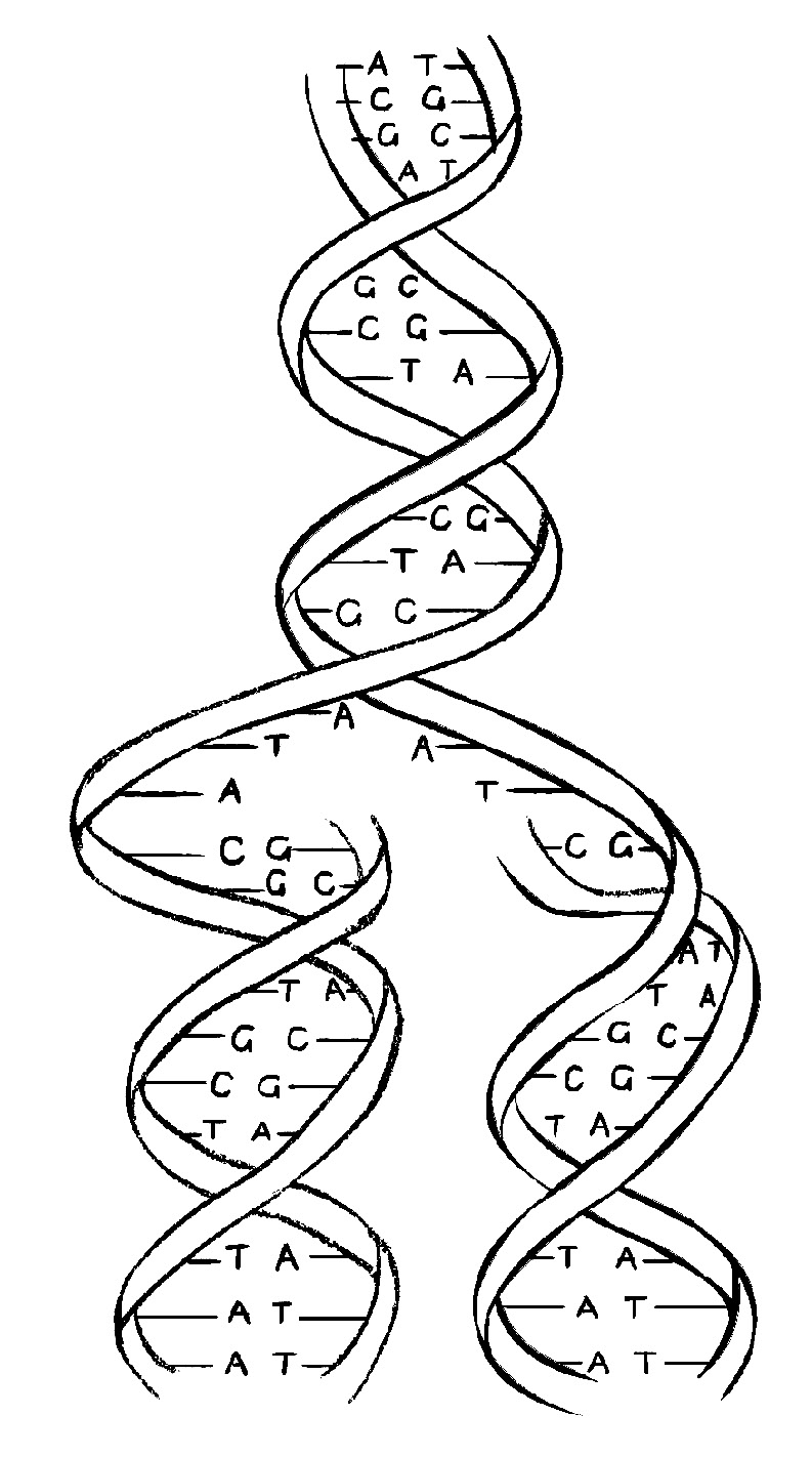 “这也是理所当然的,但是遗憾的是,尽管DNA的这种复制设计得精妙绝伦,却并不是那么天衣无缝。DNA的两束分子螺旋上共有四类彼此配对的遗传密码,这本生命之书是由四个种类的字母写成的。”