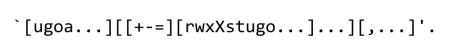 在这种格式下,所带参数是一个用逗号分隔的字符列表。每个符号方式的改变命令以零或者字'ugoa'开始;'ugoa'控制哪些用户对该文件访问权限将被改变:文件的所有者(u),与文件所有者同组的用户(g),其他组的用户(o),所有用户(a)。因此,a在这里等同于ugo。如果没有带参数,则表示缺省,与设置为a,运行效果相同,在umask中设置的位将不会受影响。