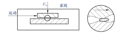 图1-3-4所示为一简单摩擦机械系统中干磨损的情况。磨损过程中发生了一对摩擦副间的相对运动,出现材料转移造成了接触表面的材料耗损,破坏了表面精度,使结合表面间不密封。这种磨损遵循如下宏观法则: