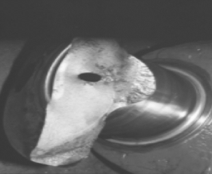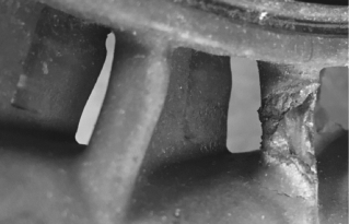 在一些发动机机型上,气体流经发动机内部,由于发动机的振动和气体特性,气体在发动机内部与机体产生强烈的碰撞。发动机压气机机体与气体的相互作用造成气体压力不断增加,气体燃烧,形成高温高压和高速燃气,高速喷出。这一系列作用使流道表面变得粗糙。这种气蚀是机械作用,对于热端部件具有高温腐蚀的作用,图1-3-17所示为分油盘气蚀磨损。
