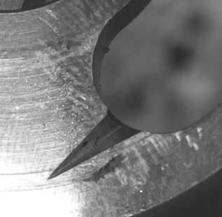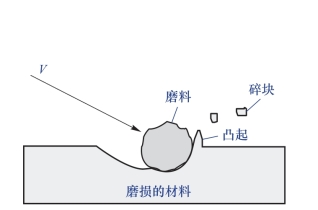 如果运动副的一个表面明显比另外一个表面硬,或者运动副中有硬的颗粒,在两个面接触的情况下,较硬表面的微凸体嵌入较软表面,同时较硬表面微凸体周围的较软表面材料发生塑性移动。当较硬表面移动时,就会在软表面产生裂沟并切削较软的材料。磨粒磨损作用与微切削过程十分相似,如图1-3-13~图1-3-15所示。磨粒磨损外观为擦伤、沟纹和条痕。