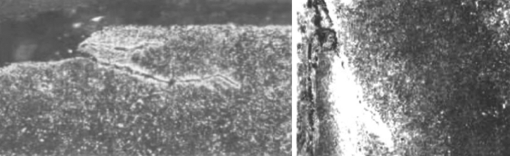 剥落与点蚀的本质是相同的,都属于接触疲劳的一种,但特征有所区别,剥落裂纹一般起源于亚表面内部较深的层次,沿表面平行的方向发展,最后形成片状的剥落坑。剥落如图1-3-9 所示,一般认为,剥落裂纹是由亚表面层的循环应力引起的。因此,分析剥落原因时,首先应考虑脉动的最大切应力,或交变的正交切应力,以及亚表层内材料性能的变化。