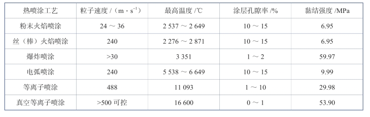 热喷涂工艺中,喷涂材料的加热温度、喷涂材料的撞击速度以及喷涂材料与基体的氧化程度影响涂层质量。不同的热喷涂方法所获得的最高温度和粒子速度不同,表1-4-11所示为部分热喷涂方法的参考工艺参数。