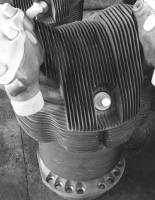 喷丸是弹丸以高速度撞击零件表面,使表面产生残余压应力并形成细化亚晶粒的冷作硬化层,从而提高机件的疲劳强度和抗应力腐蚀能力,延长零件的使用寿命。喷丸可用于齿轮等零件的表面强化,以及压气机和涡轮叶片榫头两侧的微动损伤防护。叶片榫头两侧喷丸强化后,表面硬度增加,对微动区域疲劳裂纹的萌生有一定阻碍作用。强化层的残余压应力减小了裂纹的扩展速率,喷丸后在金属表层生成数百兆帕的残余压应力,有利于提高零件的疲劳强度。图1-4-72、图1-4-73所示为喷丸前和喷丸后的活塞。