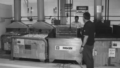 发动机零部件的材料、材料保护涂层、镀层和污染物的组成不同,对清洗方法、技术提出了更高的要求,促使了清洗工艺的发展。新的清洗方法、工艺和设备不断出现,大大提高了清洗效率,扩大了清洗范围,提高了清洗质量。主要的清洗方法有油洗、水溶液清洗和干洗。企业也可以根据清洗工作情况,设置清洗工艺流水线,提高清洗效率、清洗规范性和过程可见性。图2-3-1所示为清洗槽,图2-3-2所示为某航空发动机清洗生产线。
