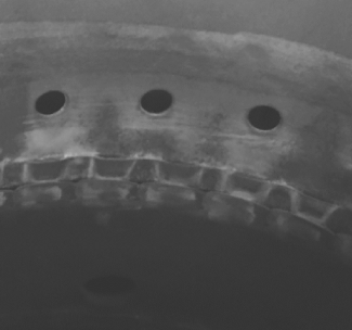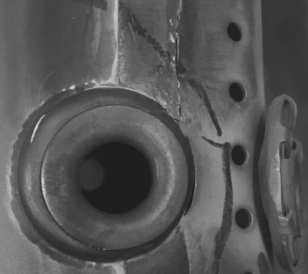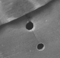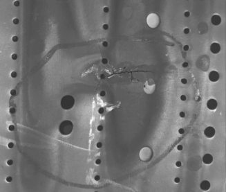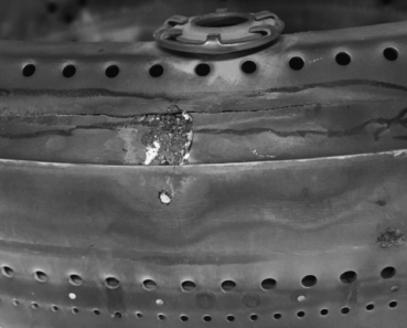 前、中和后套主体材料及焊缝裂纹,在裂纹末端冲眼,钻止裂孔,打磨待焊处,补焊。燃烧室内壁孔边小裂纹,可焊接修理,燃烧室内壁孔边裂纹如图2-6-5所示,燃烧室壁面焊接处裂纹如图2-6-6所示。
