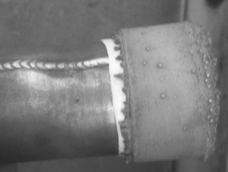 传焰管部分烧蚀和裂纹时,打磨去掉损伤处或切除故障部分,从好的传焰管上切除需要的部分,焊接于故障件上。传焰管根部烧蚀和裂纹时,打磨掉损伤处,取下故障传焰管,装新传焰管。使用专用工装把新传焰管和与其配合的火焰筒定位,点焊固定新传焰管,专用工装如图2-6-11所示。点焊后,检查点焊定位质量;点焊后若定位有偏差,则校正后再重新点焊固定。固定完成后,正式焊接,焊好后探伤应无裂纹,图2-6-12所示为焊接修复后的传焰管。