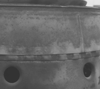 安装边磨损或裂纹时,堆焊,打磨成型,恢复原来的形状和机械性能。燃烧室表面允许存在轻微的局部腐蚀,图2-6-7所示为燃烧室局部高温燃气腐蚀。非严重的局部高温燃气腐蚀时,打磨去掉腐蚀物,恢复防护层。严重高温燃气腐蚀时,则更换新品,图2-6-8所示为燃烧室大面积高温燃气腐蚀。