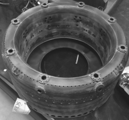 燃烧室的故障不仅损坏自身,也危及其他热端部件,甚至导致严重的飞行事故。下面以某型涡喷发动机的单管型燃烧室和JT15发动机环型燃烧室为例,介绍燃烧室的常见修理方法和工艺,图2-6-3所示为JT15发动机燃烧室全貌。