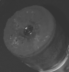 喷嘴积炭易造成喷嘴局部堵塞,影响雾化质量,导致喷油不均,燃油雾化质量不良,进而导致燃油浓度场不稳定;也可能出现火焰后移,降低燃烧效率,燃烧室出口局部温度过高,图2-6-16所示为积炭严重的燃油喷嘴。局部的高温气流易导致火焰筒和涡轮导向器及转子叶片过热和烧蚀。