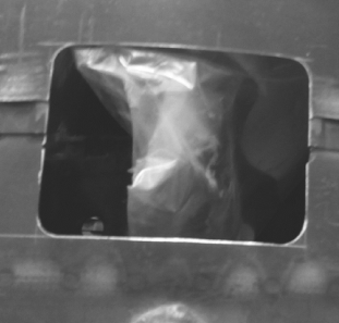 壁面的长裂纹如图2-6-9所示,补片修理。补片时,根据故障形状画线,将故障部分切除,如图2-6-10所示。切故障区域时不局限于固定形状,根据损伤区域及位置来定,常见的有矩形、椭圆形和三角形,但一个火焰筒不能补片次数过多,每个补片面积不超过规定面积。补片材料所属的火焰筒寿命应等于或大于故障火焰筒寿命,补片材料所属的位置应和故障火焰筒的故障处同位置,补片材料的面积等于或稍大于故障区域。将补片材料与故障区域比对,画线打磨,修整出需要的形状、尺寸和表面。放于故障区域的内嵌片应与故障区域保持一定的焊接间隙,以保证焊接质量。可使用风动砂轮切割内嵌片、烧蚀、龟裂和穿孔区域。