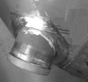 局部过热时,易导致燃气导管壁面鼓包变形,鼓包处未烧伤时,可使用胶木榔头敲击校正。鼓包处烧伤、烧蚀时,补片焊接修理。