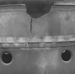机匣主体裂纹一般比较少,多数产生在圆柱段滚焊缝和安装座焊缝附近。圆柱段裂纹一般比较稳定,多数裂纹发展至滚焊缝就停止,也有部分发展为超过滚焊缝而裂至圆锥段。机匣筒状部分加强环的裂纹,不长的允许锉掉裂纹;有一定数量和长度的裂纹,打光裂纹处,补焊修理;加强环扇形面撕裂掉块时,允许补片。当机匣主体材料缺陷,如腐蚀坑等导致漏气时,补片或更换机匣。机匣加强环上的半圆凹槽最低处易产生裂纹,一般发展到加强环与筒体的焊接处则停止,修理时,开槽去掉裂纹区域,保留焊缝加厚区,补焊开槽区,打磨修整。