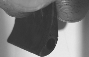 目视检查蜂窝层密封工作面,划伤和磨损不超过规定时可用。磨损、毛刺,打磨机打磨,锉修去毛刺。蜂窝层内部有异物,如图2-7-25所示,使用工装将杂物勾出。磨损超过规定深度更换封严圈,去除旧封严圈,真空钎焊新封严圈。封严圈与壳体配合的表面有轻微的金属凸起,可打磨至平齐。封严圈圆周结合处有裂纹,重新焊接。封严圈与基体金属间有裂纹和掉块时,换装新件。蜂窝层与转子叶片的间隙小,线切割或车削蜂窝层,尺寸小时,更换新件。蜂窝层焊接时,焊料堵塞、材料倒塌及磨损可能导致蜂窝格缺失,缺失面积符合要求时,允许使用。蜂窝层与导向器壳体跳动超差时,使用专用工装调整。