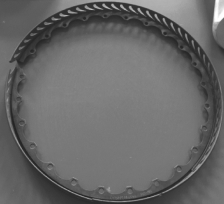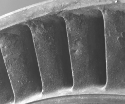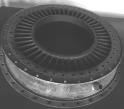目视检查外罩材料的凸起或凹陷,不超过规定次数的凸起或凹陷锉修排除。外罩裂纹和焊点脱落,外环外圆圆度超差时报废。内外环燃气通道表面允许储存点状凹坑和非穿透性砂眼,但靠近排气边的范围内不应有砂眼、铸疤和疏松。叶片、内环和外环上允许有规定直径范围内的气孔和夹杂。