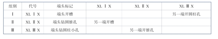 (2)节径(中径)加大螺桩。为了修理方便,设计了加大螺桩,加大螺桩是指加大了螺桩紧固部分的节径。制造时加大螺桩分为三组,标记为Ⅰ组端头开槽、Ⅱ组端头钻圆锥孔、Ⅲ组端头钻圆柱小孔。代号为在原螺桩图号后标注“XLⅠX”“XLⅡX”“XLⅢX”字样,见表2-12-2。